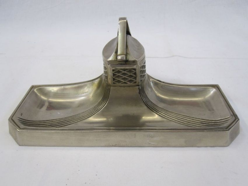 Art Deco pewter inkwell with engraved decoration, unmarked, 24.5cm wide x 10cm high
