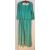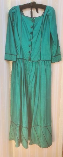 Richards Shop cotton dress with empire line waist, square neck bodice with frills, a tiered and frilled skirt, tie belt, a navy blue cotton button front dress with drop waist, white collar, three-quarter length sleeves, a blue and white striped maxi dress with white lace trimmed yoke, cuffs and hem labelled Shelana, size 12, a short cotton sundress, a blue spotted sundress labelled A Bien Coupe, a blue chiffon evening dress, a green polyester maxi dress, a Valerie Goad pink maxi dress, sleeveless, full skirt, labelled, size 3, a Margaret Thursby turquoise skirt and an Irene Isaac raw silk ball dress with dropped waist, dark blue detailed, button front, bow at the back and tiered at the hem (10)