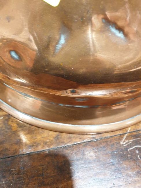A Victorian copper 2 galleon jug and a two handled copper pan (2)Condition ReportPan Approx. Diameter 35.5cm, Height (excluding handles) 10.5cm.Some patches of lost finish throughout. Some dents and polish residue. Wear and dulling to pan interior.