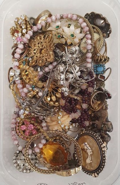 Quantity of costume jewellery, beaded necklaces, costume watches, brooches, rings (1 box)