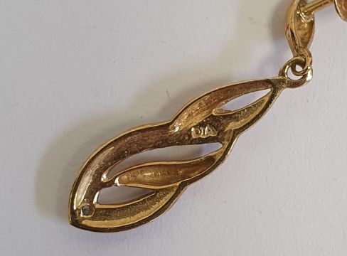Pair 9ct gold hoop earrings, 1.5g approx., a 9ct gold dolphin drop pendant, 1g, pair 9ct gold drop earrings, 1.5g, pair of 9ct gold and simulated pearl drop earrings and a pair of 9ct gold and red stone set earrings, 1.5g (5)