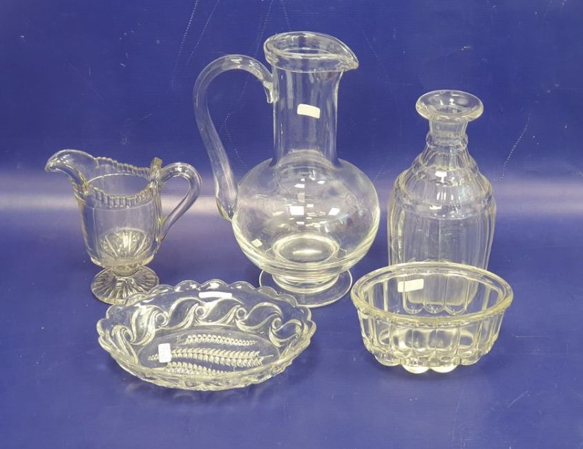 Dartington glass jug, a 19th century water carafe of panelled design, a pressed glass jug and two other items (5)