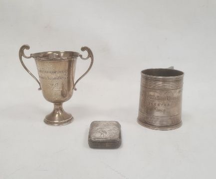 1920's silver miniature trophy cup 'Cheltenham Jubilee Tennis Tournament 1927', London 1926, 1.5ozt approx., 10cm high a Victorian christening mug 'Edward William Harnem, Gloucester, January 26th 1869', London 1864, 2.5ozt, 7cm high approx. and a silver vesta engraved ' Alfred Robinson.. 1888'. (3)
