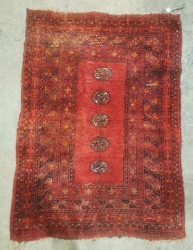 Red ground Eastern rug with five elephant's foot guls to the central field, stepped border, 110cm x 79cm