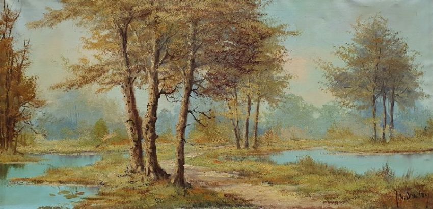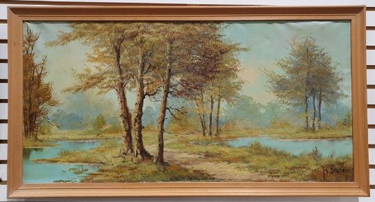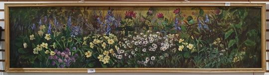 S Anqus Oil on boardWild flowers, signed lower left, 30cm x 121cm Downey(?) Oil on canvasMarsh scene with path, signed lower right (2)