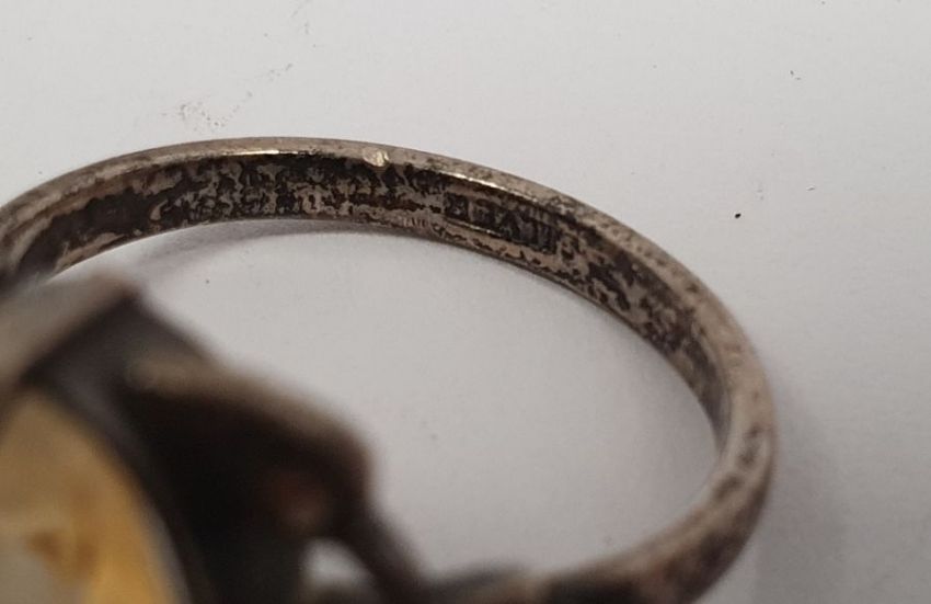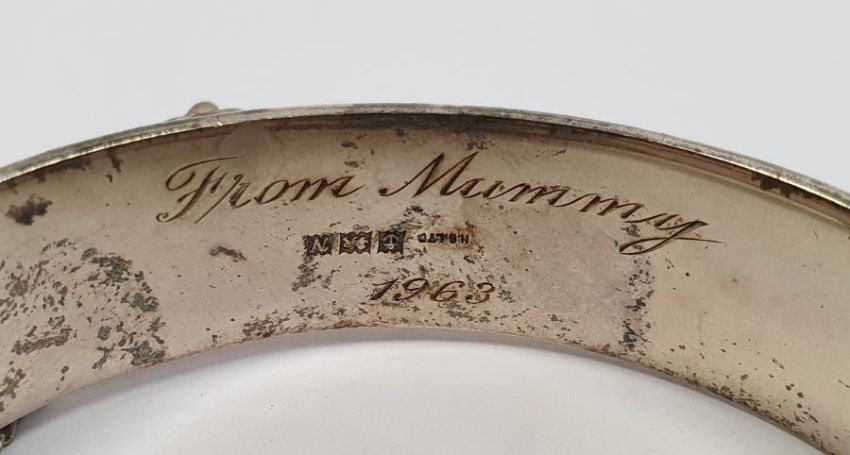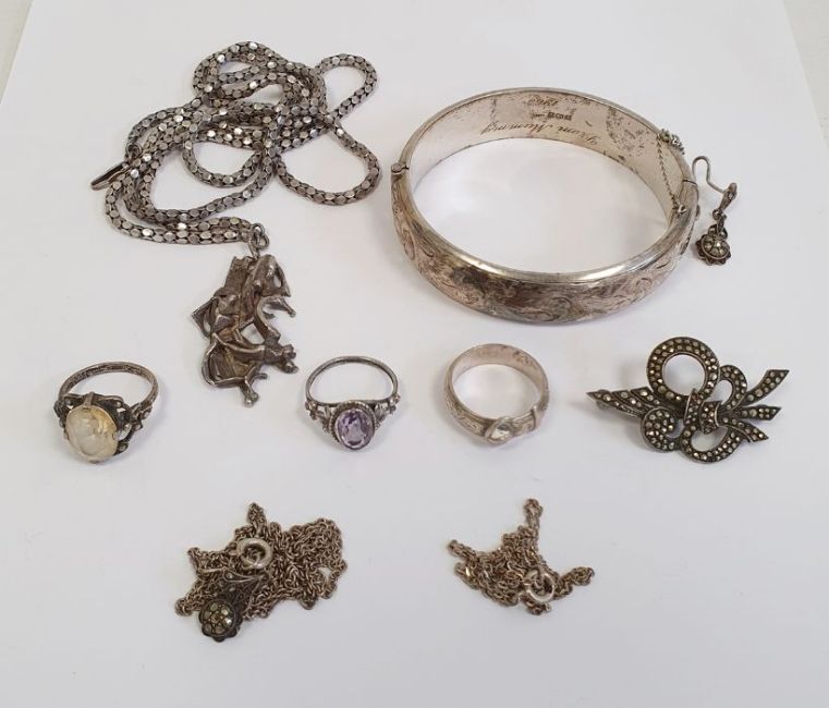Silver bangle initialled, silver amethyst ring, silver brooch and other silver and coloured jewellery