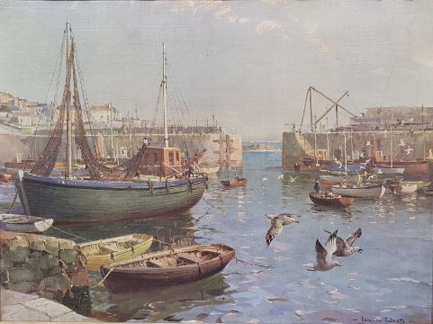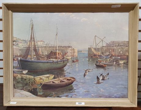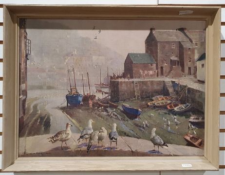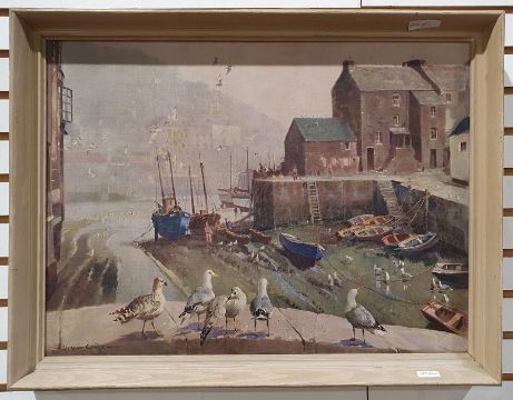 Oval mirror and a convex circular mirror in gilt frames and two framed prints of harbour scenes after Vernon Ward (4)