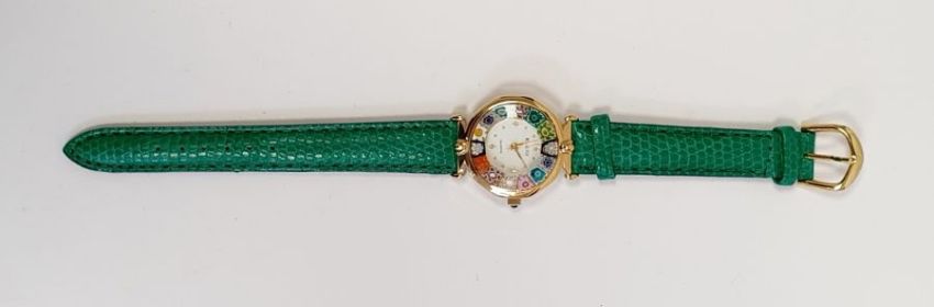 Brooks and Bentley Rialto gilt metal and millefiori wristwatch with green crocodile effect strap in case