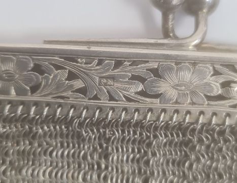 An early 20th century silver chain purse, with import marks, marked 925, foliate detail to clutch, 10ozt approx.