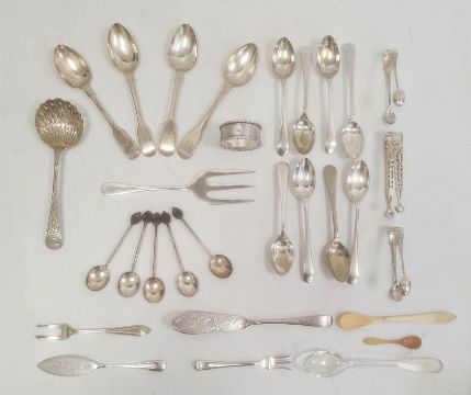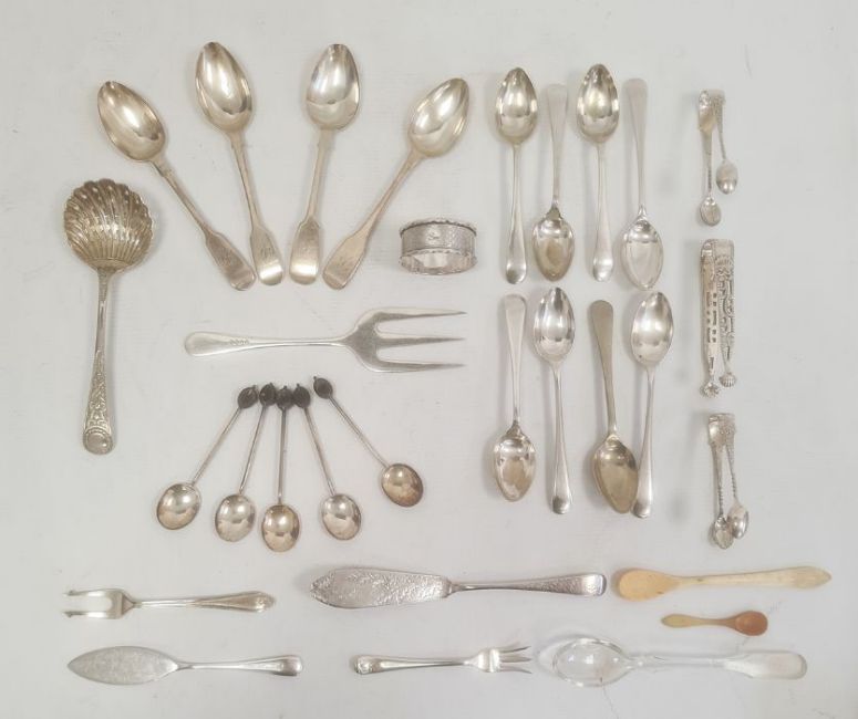 Assorted silver and plated spoons, coffee spoons, teaspoons, sugar nips and a silver napkin ring (1 box)