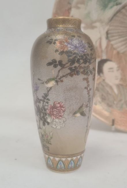 Japanese Satsuma plate depicting a mother and child and two other figures, 25cm wide and a Japanese Satsuma vase decorated with panels of birds, 12.5cm high (damaged) (2)