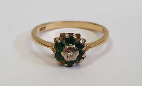 Green and white stone cluster ring, marked 18ct, finger size M, approx. 3g