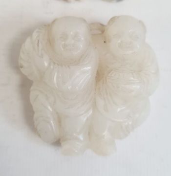 Hardstone standing figure of a laughing Buddha, 19cm high (with repairs) and a jade carving of two figures, one carrying a lotus flower, the other a covered bowl, 5cm high (2)  Condition ReportAdditional pictures