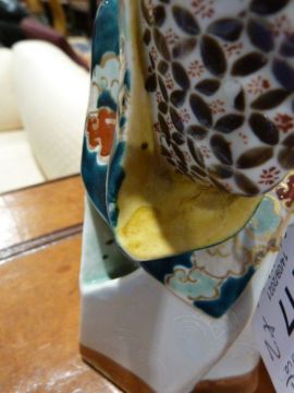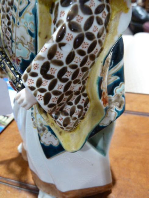 Japanese porcelain figure of a man in robes holding a sword and another figure holding a spear, 24cm and 22cm high (2) Condition ReportThe images have some apparent slight loss of paint in the bases and sleeves.There maybe restoration to the inner sleeves of the male figure. we have not examined them under UV light.No apparent cracks or chips.