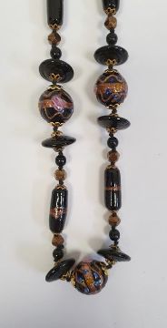 Probably Edwardian aventurine and enamelled glass necklace with variously shaped beads and an EPNS miniature sugar box and cover (2)