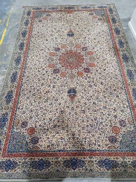 Cream ground modern rug with allover foliate decoration, stepped border, 457cm x 275cm