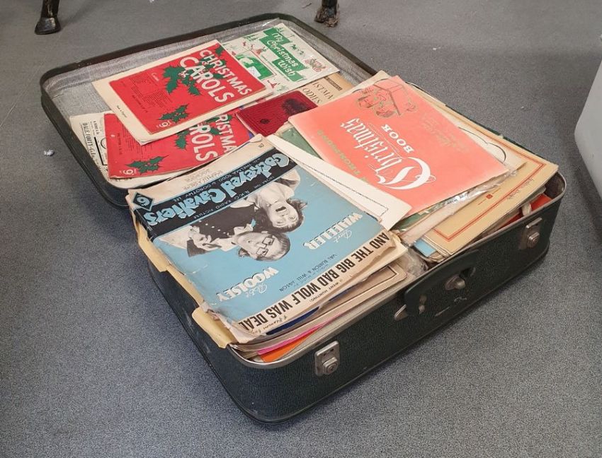 Suitcase and contents of sheet music including children's songs, musicals such as West Side Story, etc