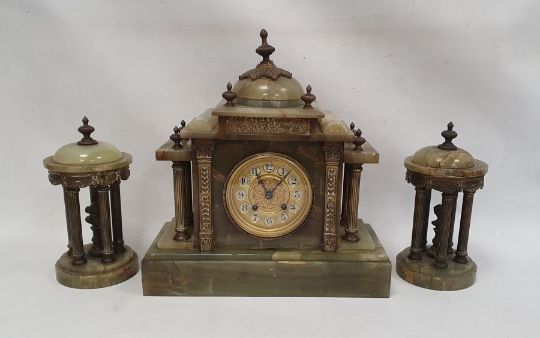 Victorian green onyx and brass clock garniture the clock with Arabic numerals Condition ReportDiameter of clock face bezel is Approx. 12cm