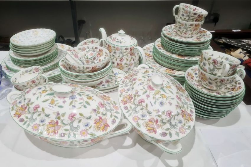 Quantity of Minton 'Haddon Hall' pattern porcelain part dinner and tea serviceCondition ReportAbout a third of the bowl, plates and dishes are in used condition with fouling and fading of the pattern and some chipping at the edges.The other just some dirt and dust on the surface.Most appear to have a green mark next the Mintons crest suggesting they are likely to be 2nd quality.