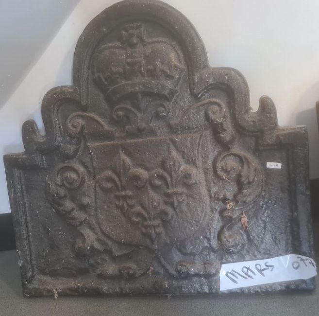 Cast iron fireback with shield decoration surmounted by a crown, the shield three fleur-de-lys