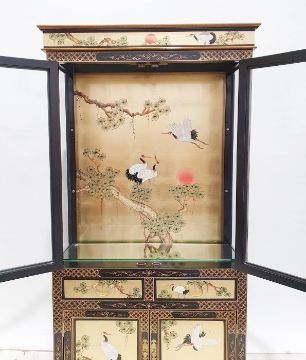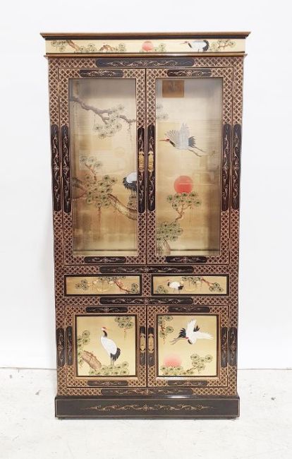 Pair of Chinese style cabinets with painted decoration, two closed doors above two single drawers, two cupboard doors, plinth bases (2)