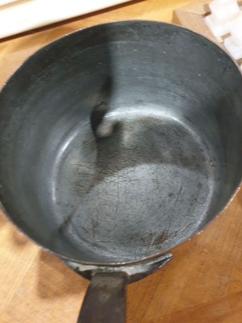 A set three copper and iron handled pans with lids Condition ReportTwo are 20.5cm in diameter, one is 16.5cm.Interiors are darkened and some scratches.See pictures.