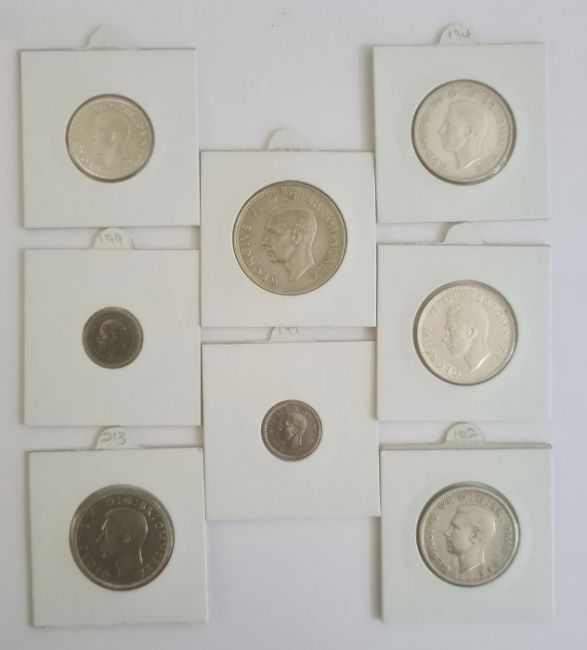 Eight George VI silver coins, labelled, in sealed containers, from very fine to uncirculated, a nice group of coins