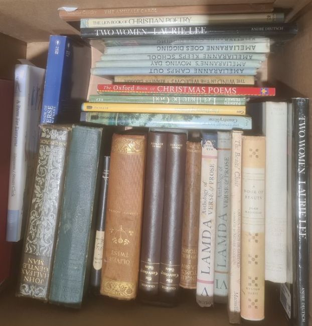 Assorted volumes to include poetryAmeliaranne"Camps Out",Moving Day"Keep School""Goes Digging"Lee, Laurie"Two Women"Dickens, Charles"Oliver Twist" imperial editionAntiquarian to include:-Longfellows Poetical Works with wood boards impressed with dried ferns, leather backstrip (3 boxes)