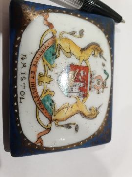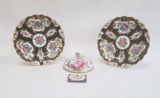 Pair of Worcester-style porcelain plates of shaped circular form, decorated with painted panels of flowers within gilt bordered cartouches, on a blue fish-scale ground, 20cm diameter, a Meissen-style porcelain domed cover with painted decoration (no base) and one other item (4) Condition ReportGeneral wear throughout, imperfect to one plate base. Bristol piece has loss of colour and gilt, scratching throughout. Dome cover has general wear and a small chip to the gilt rear edge.See pictures.