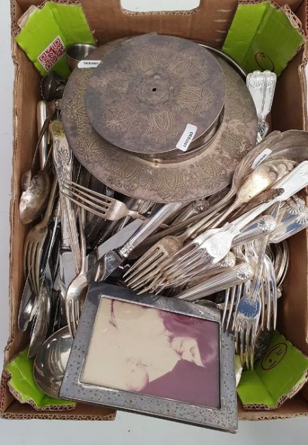 Quantity plated flatware, picture frame, two pots, ladledressing table sets, a small quantity of pewter ware (3 boxes)