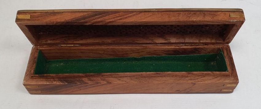 Wooden fan with pierced decoration, another fan in rectangular brass-bound figured hardwood box with pierced cover and a Persian copper server with leaf decorated blade and horn handle, script engraved to base (4)