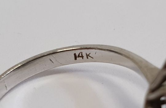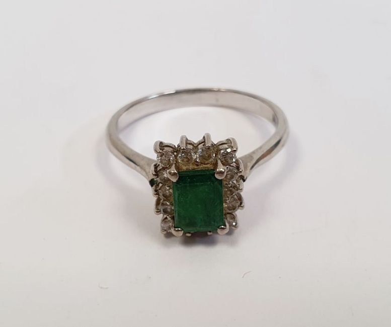 14ct white gold emerald and diamond cluster ring, the baguette-cut emerald 4mm in diameter surrounded by thirteen tiny diamonds, 3.5g in total