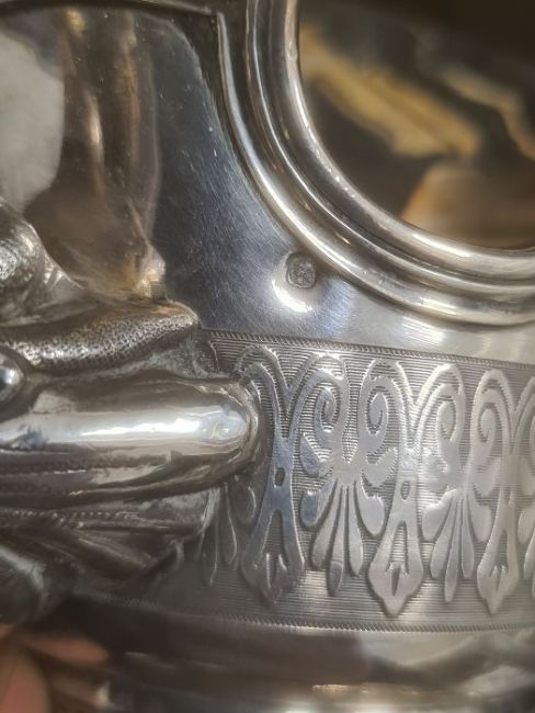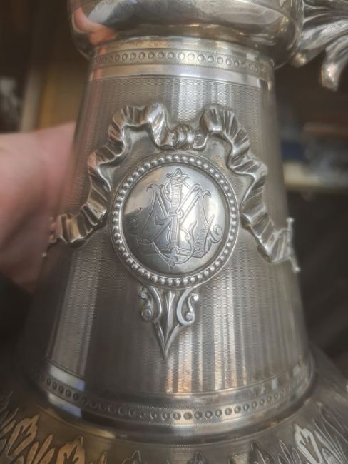 19th century French silver toilet suite by Auguste Louis Fizaine (1858-1879), comprising ewer, basin and chamber pot, the ewer of baluster form on circular pedestal foot with figural mermaid handle, 34.5cm high, approx. 44oz, the basin of shaped circular form on pedestal foot, 42cm diameter, 51oz and the chamber pot with two scroll handles and on pedestal foot, 13cm, approx 39oz, all with bands of engine-turned and anthemion decoration and with applied swag and cartouche with engraved monogram, all bearing maker's mark and Minerva 950 standard guarantee mark (3)