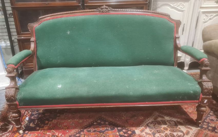 Victorian sofa mahogany frame, green upholstered seat back and armrests, turned and fluted front legs to white china castors