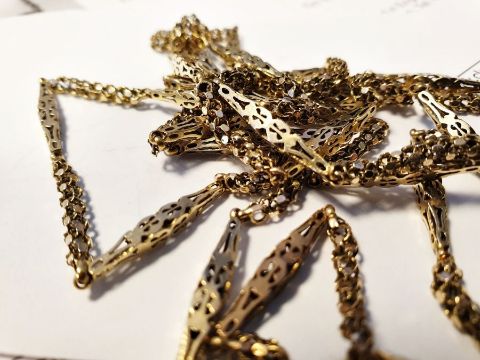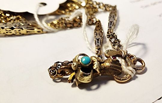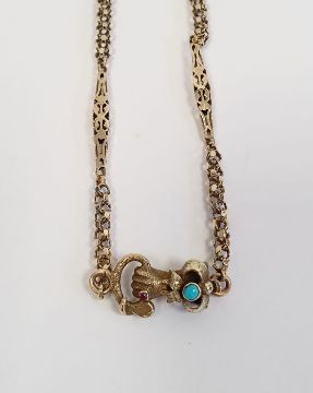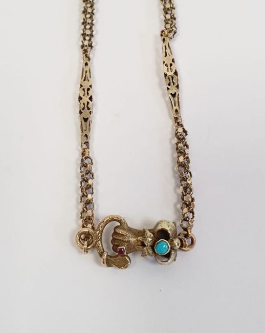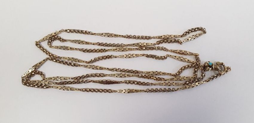 Victorian gold-coloured guard chain with alternating fancy links and with a clasp modelled as a hand and serpent set with a turquoise and ruby, 26g approx., unmarkedCondition ReportApprox. Length - 125cm (121cm minus clasp ends).