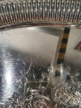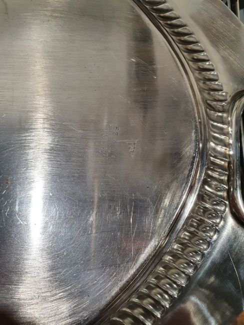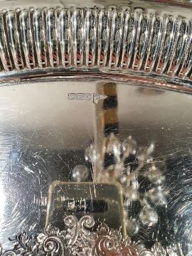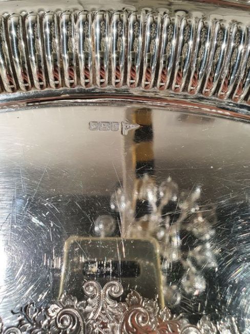 Early 20th century Walker & Hall silver two-handled oval tray with gadrooned border, foliate engraved to centre, Sheffield 1913, 96ozt approx., in fitted wooden caseCondition ReportNumerous surface scratches.  No obvious dents or dings.