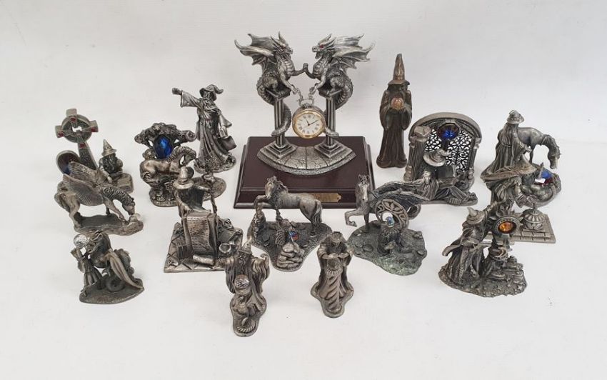 Quantity of pewter-effect models of wizards and magical scenes, including a Tudor Mint Myth and Magic limited edition model, a Danby model of Pegasus foal, etc