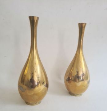 Pair of brass vases of baluster form, decorated with storks in water, 25cm high (2)