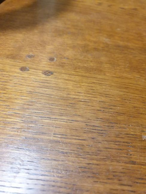20th century oak Arts and Crafts style rectangular table, turned and ringed supports and five matching chairs with rush seatsCondition ReportSome scratching to table top.Minor scuffs and marking to table legs and a chip to the corner of one of the joints.Scuffs to legs of chairs and signs of water marking to chair back.Some damage to rush seating.