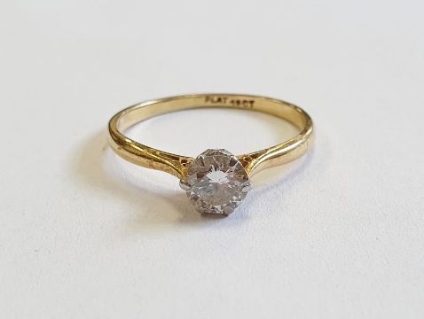 18ct gold diamond solitaire ring, round brilliant stone, 5mm in diameter approx. 0.67ct, colour H/I, clarity S11/S12, marked 18ct and platinum to the shank, in Martin & Co. fitted box, 2.3g in total approx.