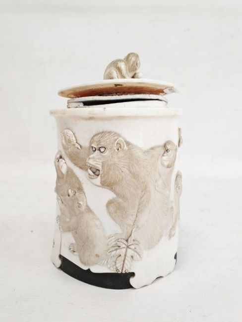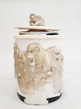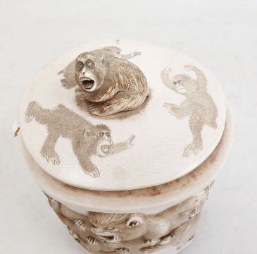 Japanese Meiji period carved ivory and ebony mounted tusk-pot and cover with monkeys autour decoration, and monkey finial to lid 20 cm tall