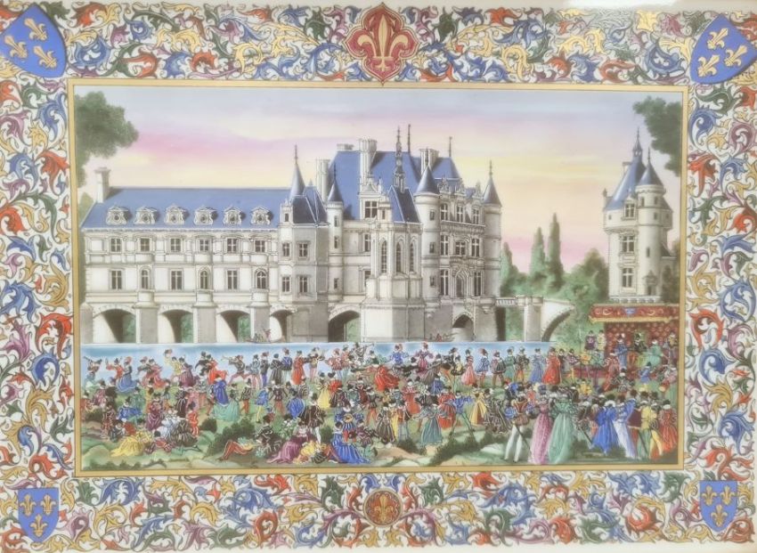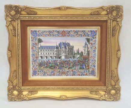 Porcelain plaque depicting Chenonceau Chateau on the Loire, with figures beneath within an elaborate border, 20cm x 27cm, in gilt frame
