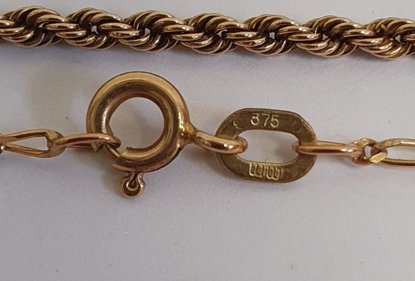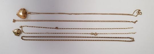 9ct gold fine rope chain, fine 9ct gold chain (damaged) and another a gilt metal heart-shaped locket on fine chain and another locket pendant