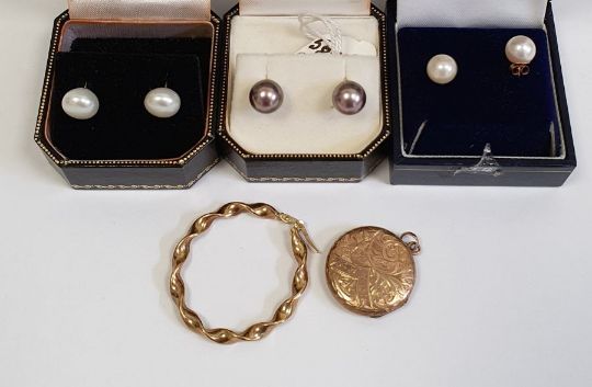 Three pairs cultured pearl earrings, each boxed, single 9ct gold hoop earring, spirally twisted, 1.5g and a gold coloured Edwardian circular locket "Exmouth '05", unmarked (5)