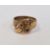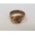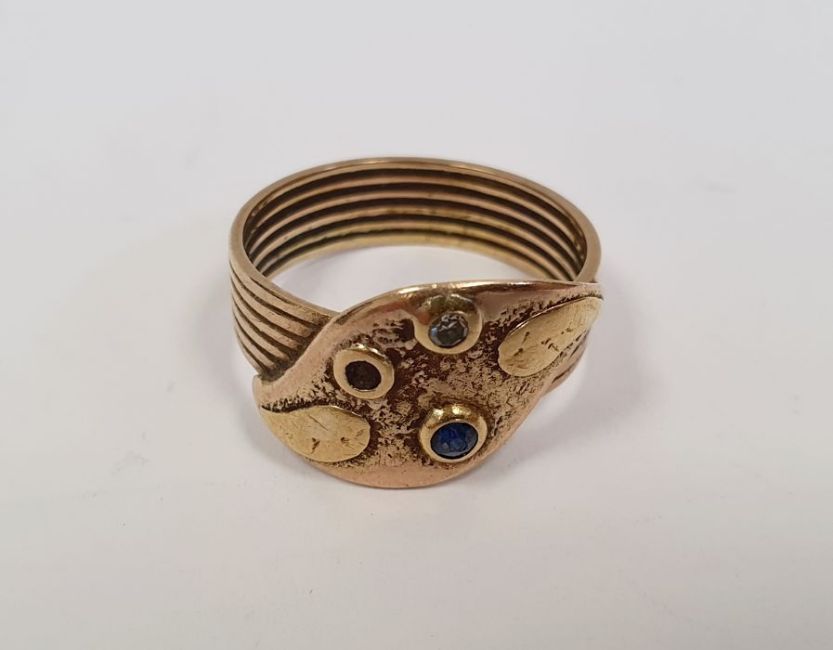 Gold-coloured band ring surmounted by an applied leaf set with two stones in rubover setting (another missing), unmarked, finger size P, approx. 4.6g
