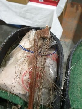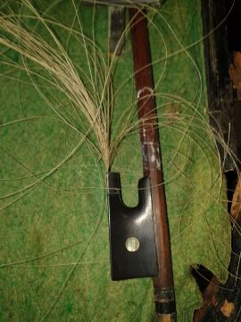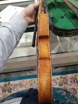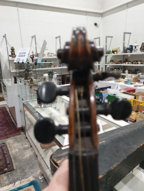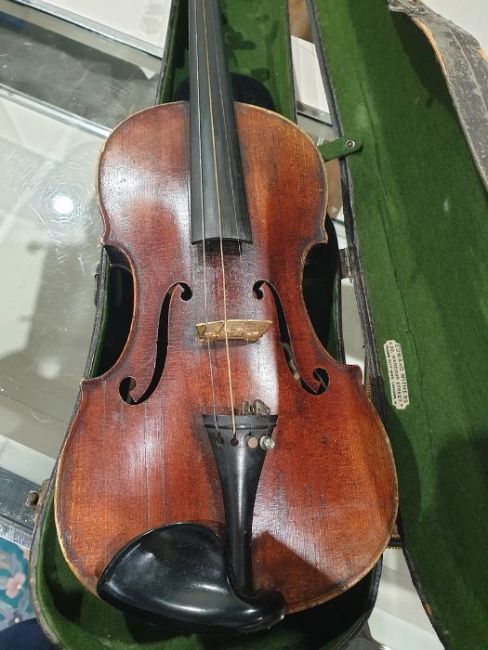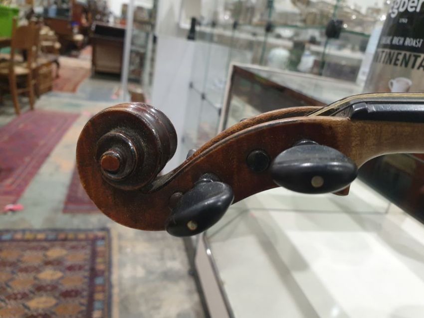 Violin with two-piece back, with two bows, in case and another violin in case and a soft case (3) Condition ReportWear through out both violins, crack to centre bottom of first pictured violin, second violin possible cracking to left side of the top face.Hair frayed in both bows.Heavy wear to cases.Both are 14inch standard sized violins.