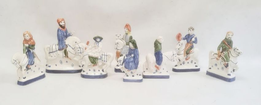Quantity of Rye pottery models of figures on horseback, depicting characters from The Canterbury Tales (8) Condition ReportSome wear and discolouration throughout.Significant damage to "The reeve" including extensive repair and losses.
