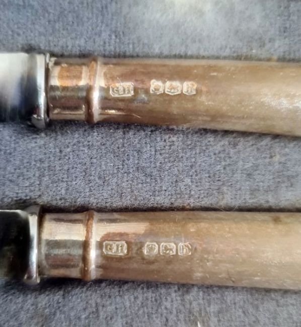 A cased set of 1920s silver handled tea knives, Sheffield 1925, a set of seven Victorian silver tea spoons, Sheffield 1896, 2ozt and a set of six 1920s silver teaspoons, Sheffield 1928, 2.5ozt approx.