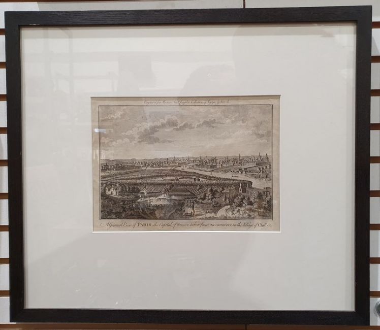 Two 18th century engraved views of Paris, one engraved from Moore's New and Complete Collection of Voyages and Travels "A general view of Paris ... taken from ... the village of Chaillot", 19.5 x 27.5cm and another engraved for the British Magazine 18 x 29cm (2)