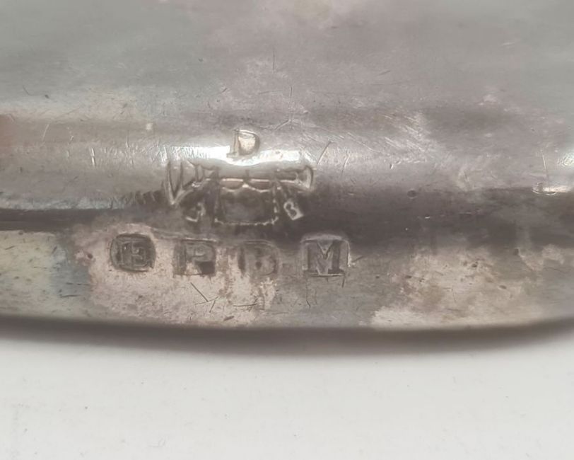 1920's silver and pink enamel circular compact, a 20th century silver letter opener, Birmingham makers W.M, cased, 0.5ozt approx, a silver-coloured metal trinket dish, apple-shaped, engraved with birds and a miniature silver-coloured metal hip flask (4)
